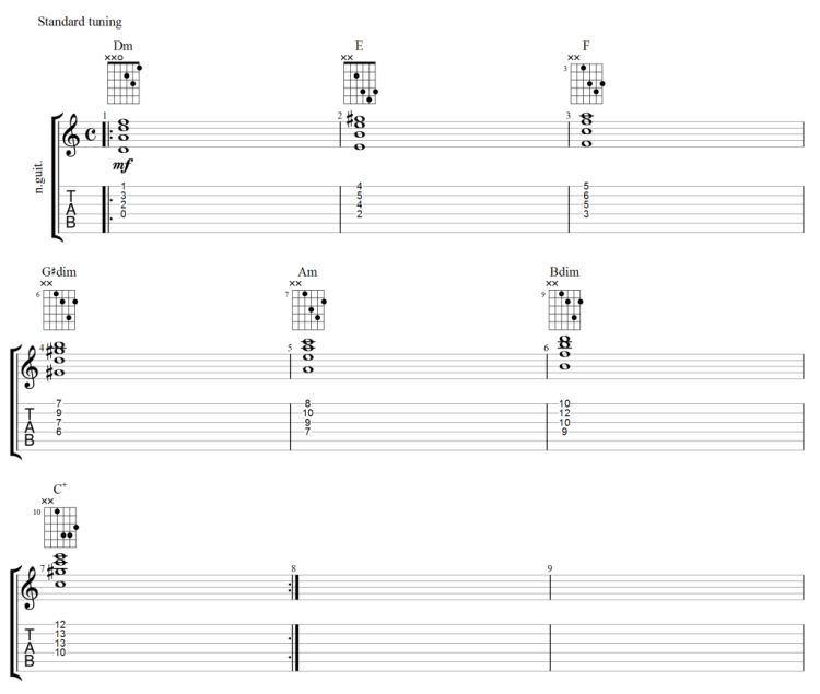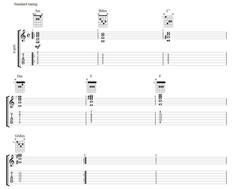 Harmonisation de la gamme mineure harmonique en Triades à la guitare :