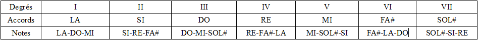Harmonisation de la gamme de LA mineur mélodique en triades :